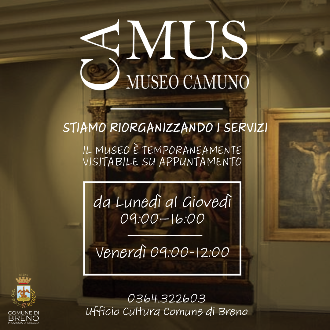L'Amministrazione Comunale di Breno comunica che, a causa di una riorganizzazione interna dei servizi culturali e logistici, l’accesso al Museo CaMUS di Breno sarà temporaneamente consentito esclusivamente su prenotazione.